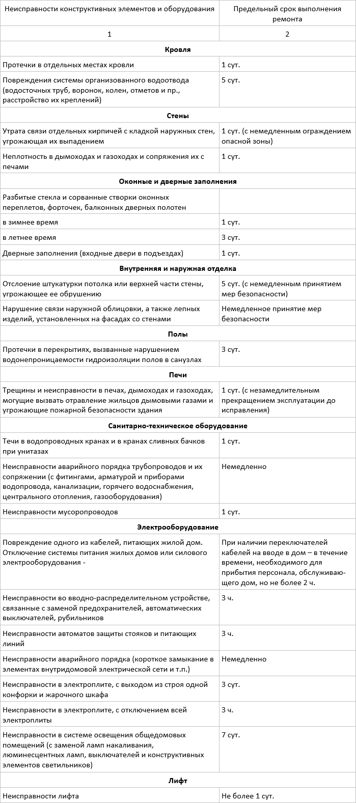 Примечание: сроки устранения отдельных неисправностей указаны с момента их обнаружения или заявки жильцов.